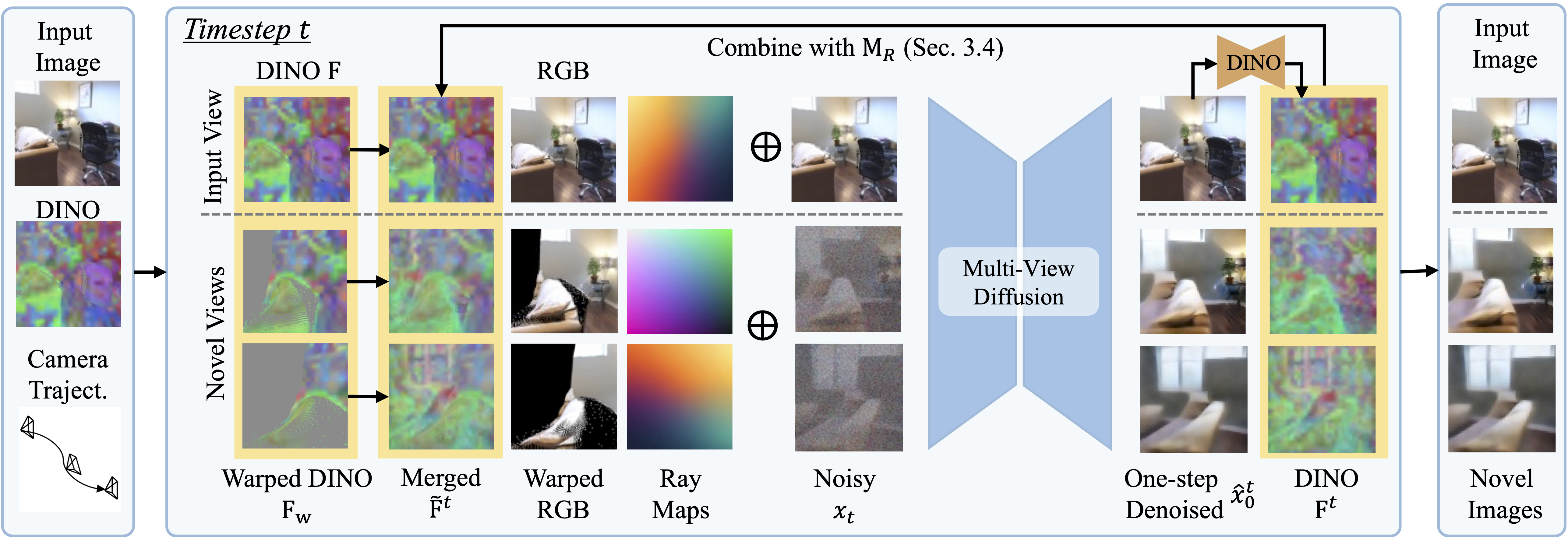 Existing NVS methods perform well for views near the input view, however, they tend to generate semantically implausible and distorted images under long-range camera motion, revealing severe degradation. We speculate that this degradation is due to current models failing to fully understand their conditioning or intermediate generated scene content. Here, we propose to integrate pre-trained semantic feature extractors to incorporate stronger scene semantics as conditioning to achieve high-quality generation even at distant viewpoints. We investigate two different strategies, (1) warped semantic features and (2) an alternating scheme of